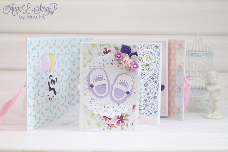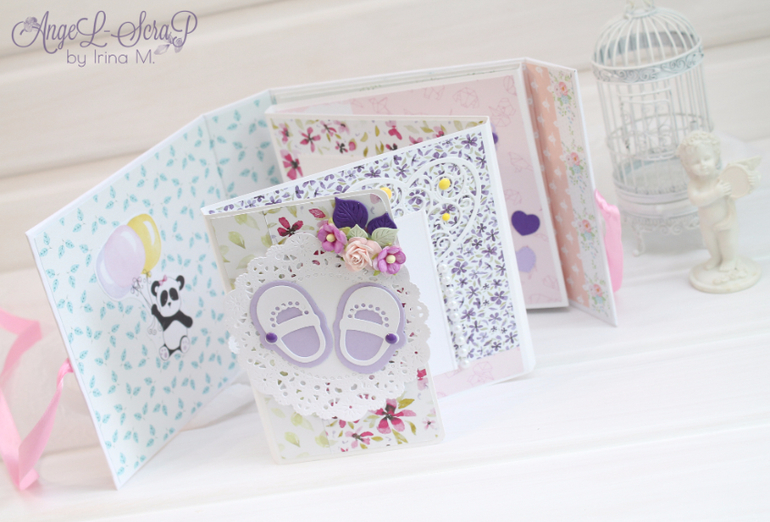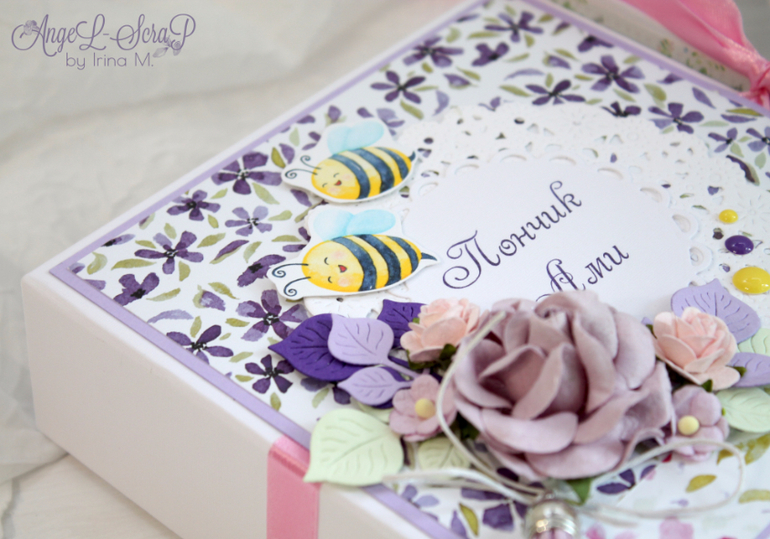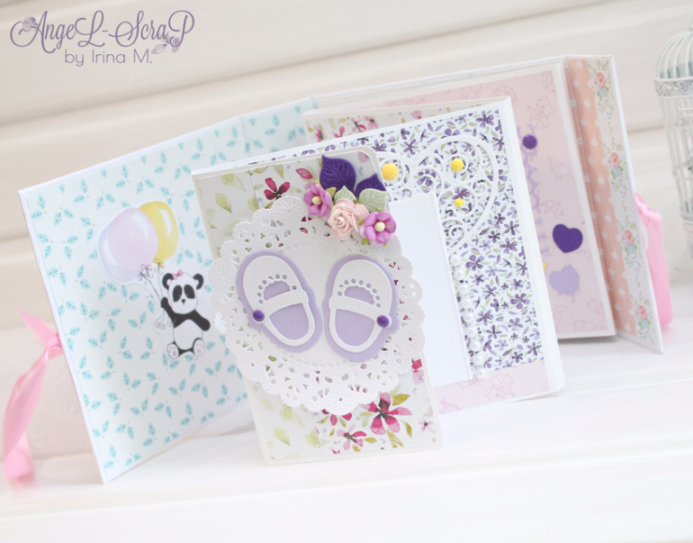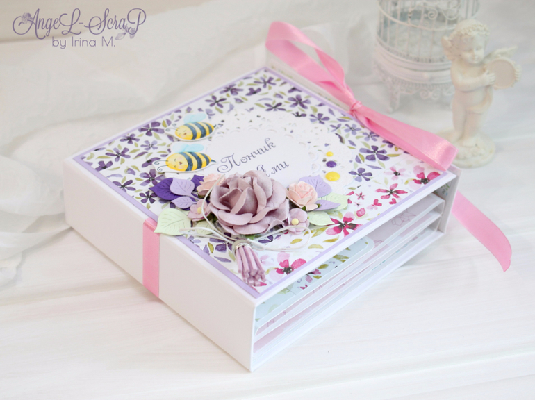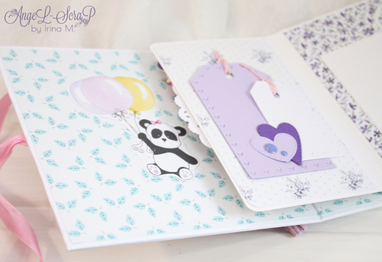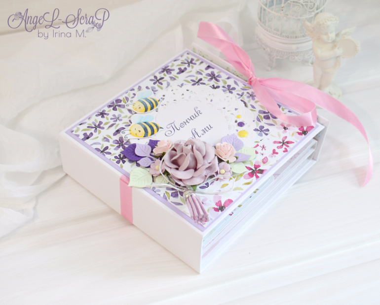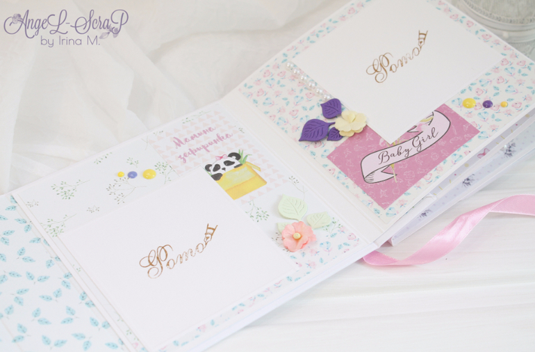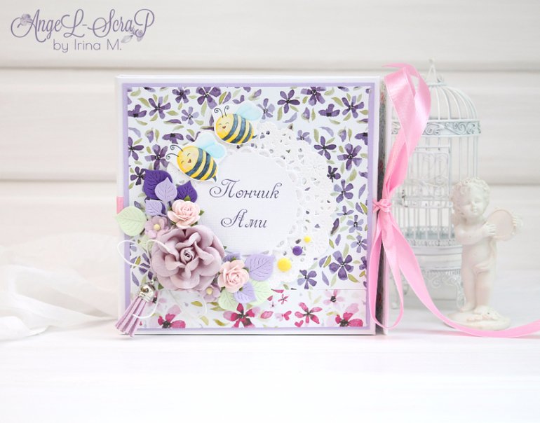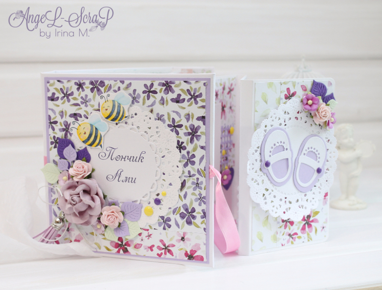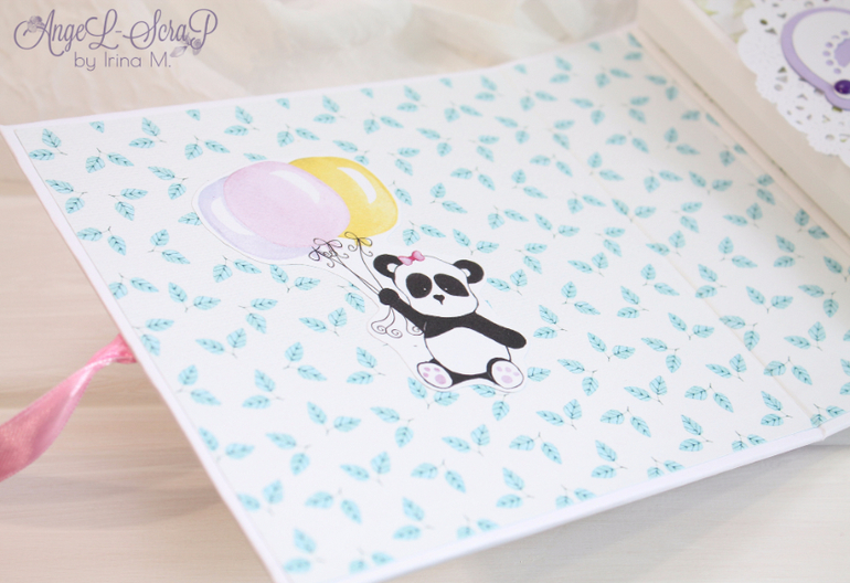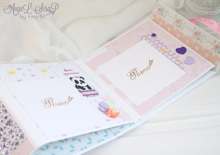 СкрапбукингВмещает 7 фото (формат 9,5х9,5 см). Размер альбома 15х15 см. Много ажурной вырубки. Странички украшены рисунками милой пандочки, а титул альбома украшает обьемная цветочная композиция и озорные пчелки.