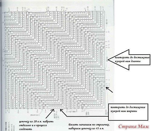 Набираете 43 петли и провязываете по схеме: грубо говоря 4 воздушные петли, столбик с накидом, потом 2 столбика с накидом в одну петлю, две воздушные петли, две петли пропускаете и 14 столбиков с накидом, далее 5 петель пропускаем (что бы угол получился) и опять 14 столбиков с накидом и по схеме. Надеюсь понятно.