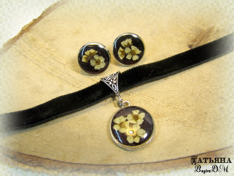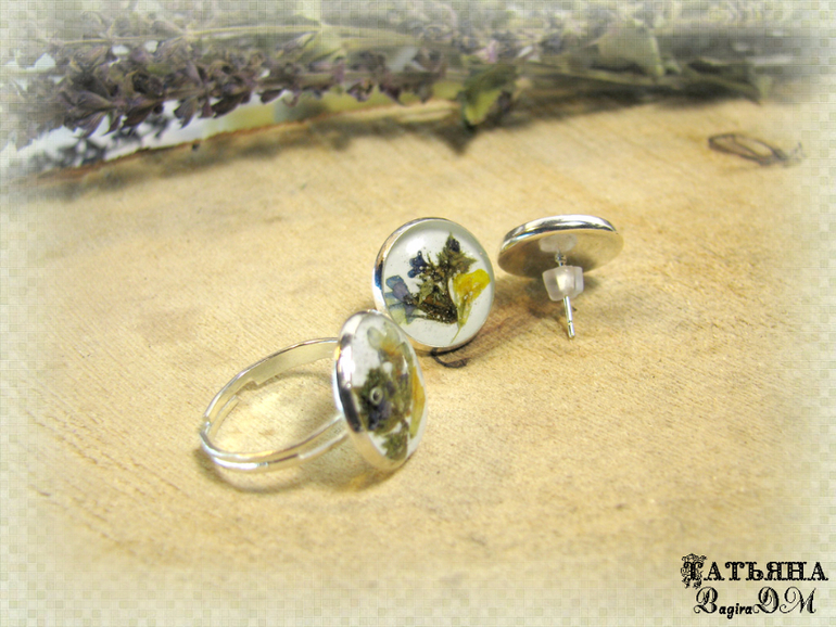 Следующий набор без чокера, просто серьги и колечко. Внутри - цветы полевых трав 3-х видов.