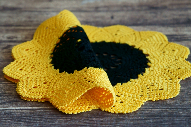 Вязание крючком (РАБОТЫ И СХЕМЫ)Салфетки "Подсолнухи".Крючок 1,25. Пряжа-черная Пехорка "Ажурная", желтая - Ализе "Мисс".