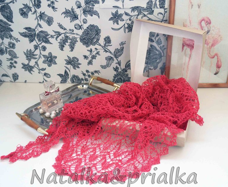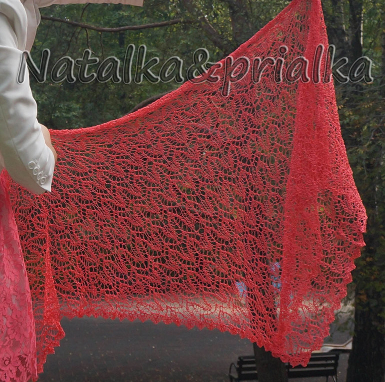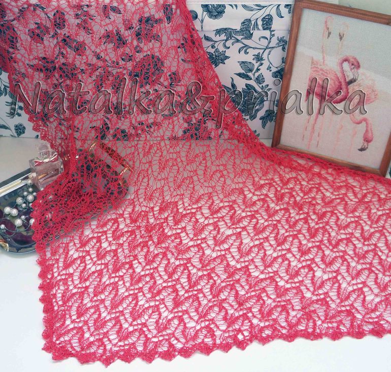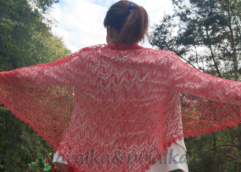 Вязание спицамиШаль цвета зари связана спицами великолепным ажурным узором.