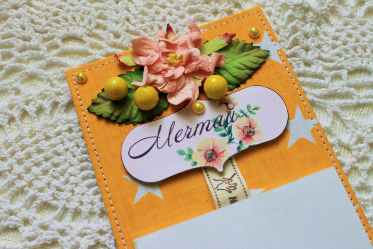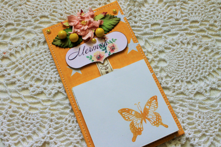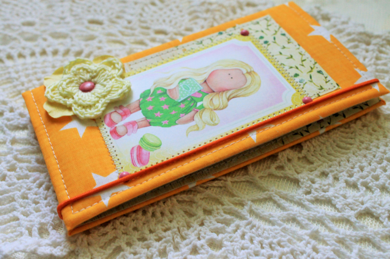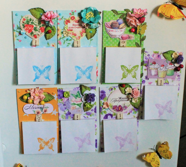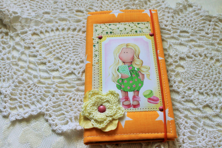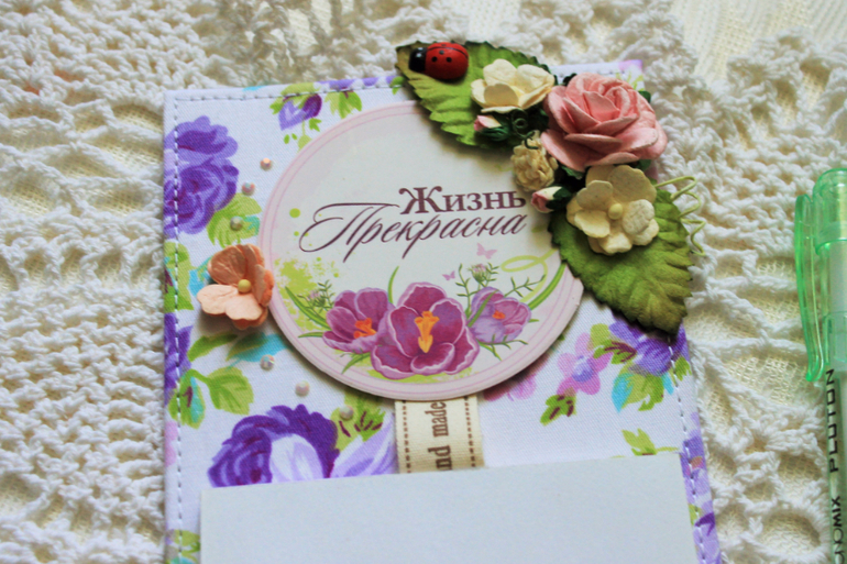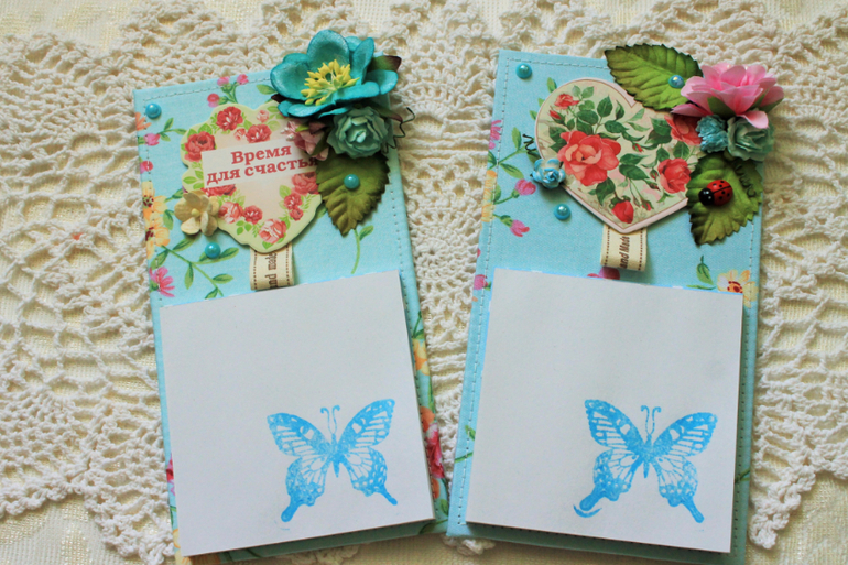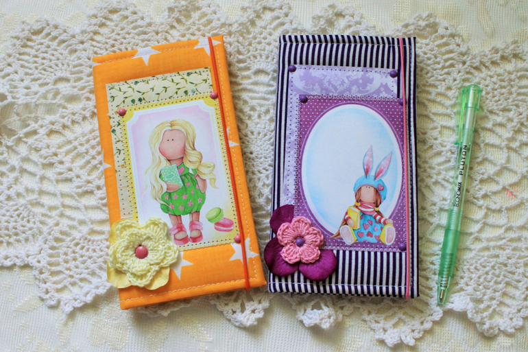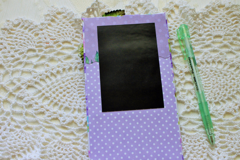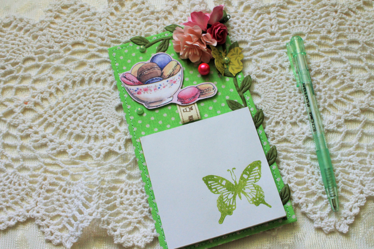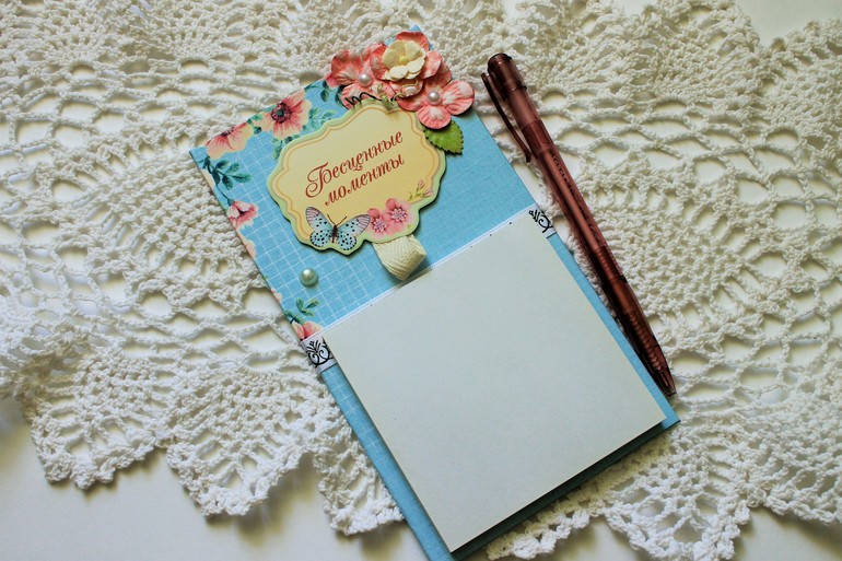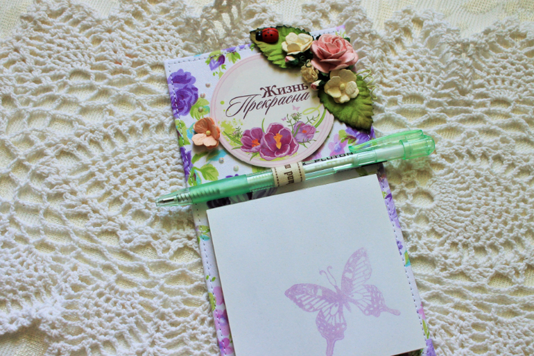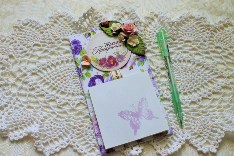 Этот был первый, картон оклеела бумагой, чуть украсила и всё. Размер 18*10см, есть петелька для ручки или карандаша, сзади немаленькие такой магнит