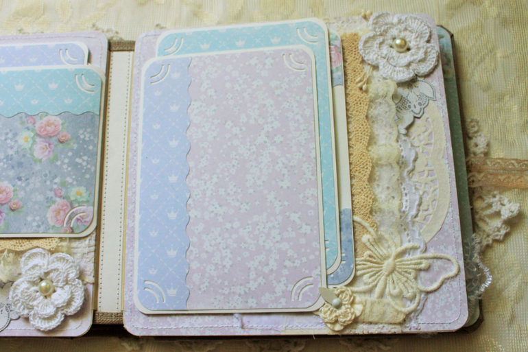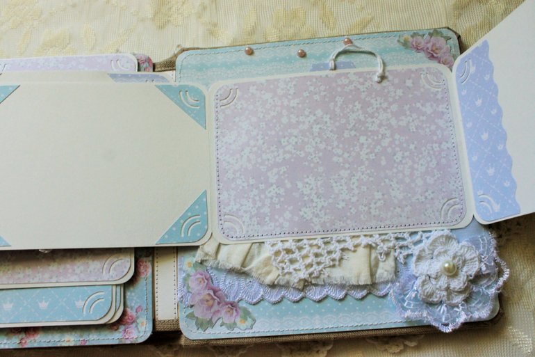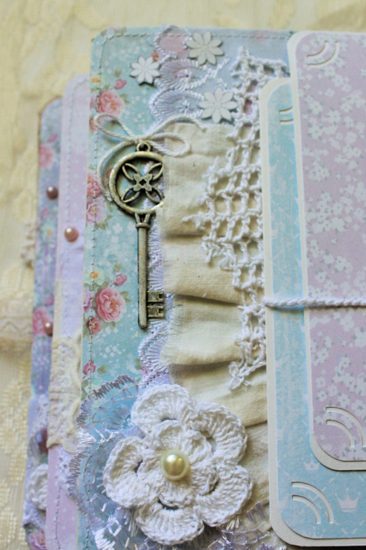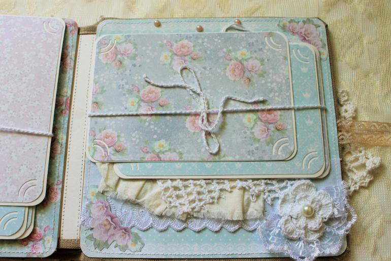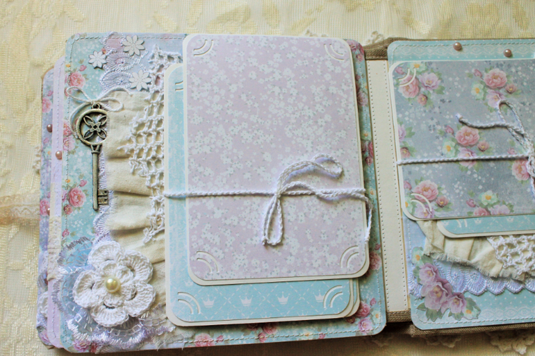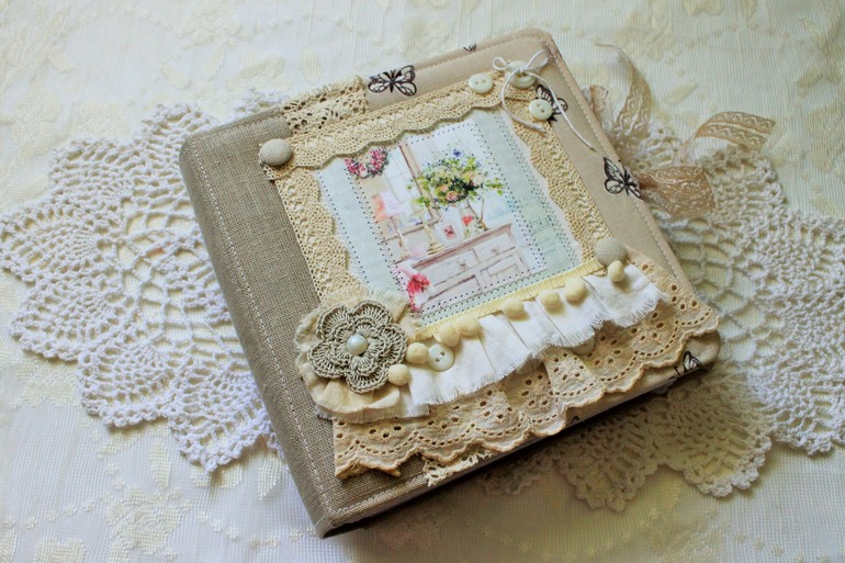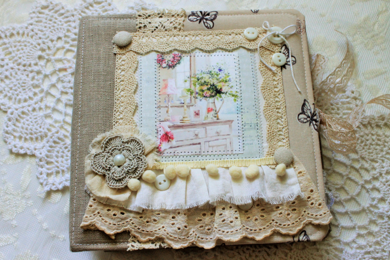 СкрапбукингАльбом в стиле шебби давно мечтала сделать, бумаги набрала, а руки не доходили. И вот, в столе заказов, мы нашли друг друга! Задачи были поставлены такие: многослойность, много фото и в бюджет уложиться, также нельзя было использовать ангелочков, фей и другую милоту. Так получился альбом формата 20*20см, 3 разворота, вмещает 42 фото 10*15см, довольно "взрослый". На страницах кружево, шитье, вязанные мной цветы. Обложка из небеленого льна и хлопка. Бумага от Фабрики Декору. Надеюсь справилась со стилем
