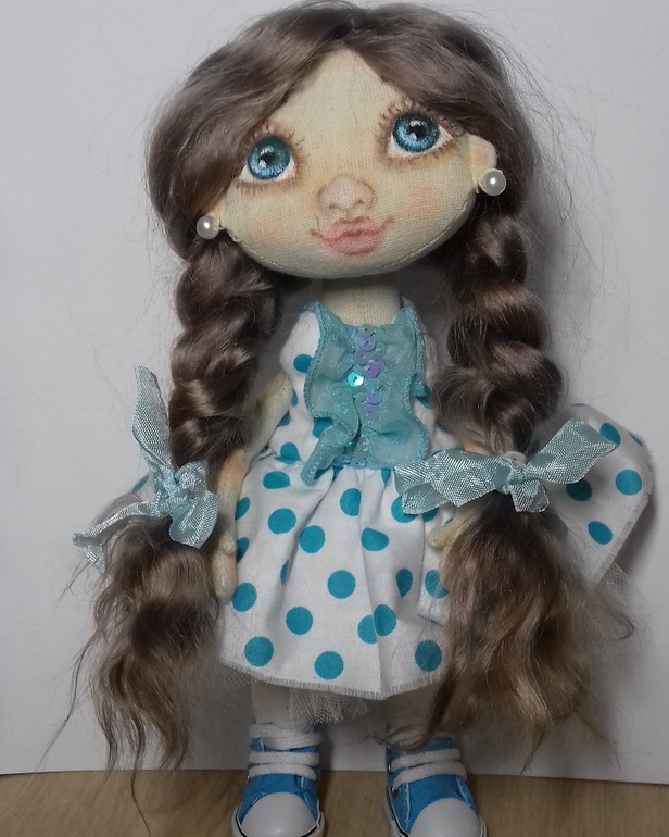 Кукла поехала жить к девочке 5ти лет. Надеюсь она ее будет любить и беречь. А теперь о кукле. Все как всегда... сшита из хлопка. Волосики-ангорская козочка... такой блеск от них. Ростиком прмерно сантиметра 23. Ручки гнутся. Стоит уверенно.