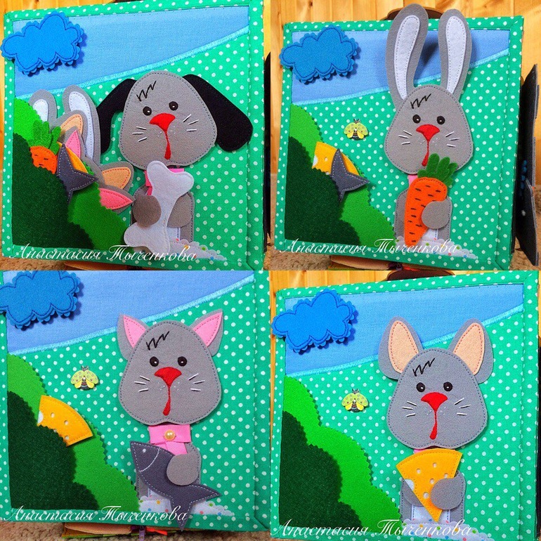 Одна мордочка на магнитной кнопке и ушки четырёх животных. К каждому из зверей мы подбираем любимую еду. И ушки, и еда хранятся в карманах-кустиках.