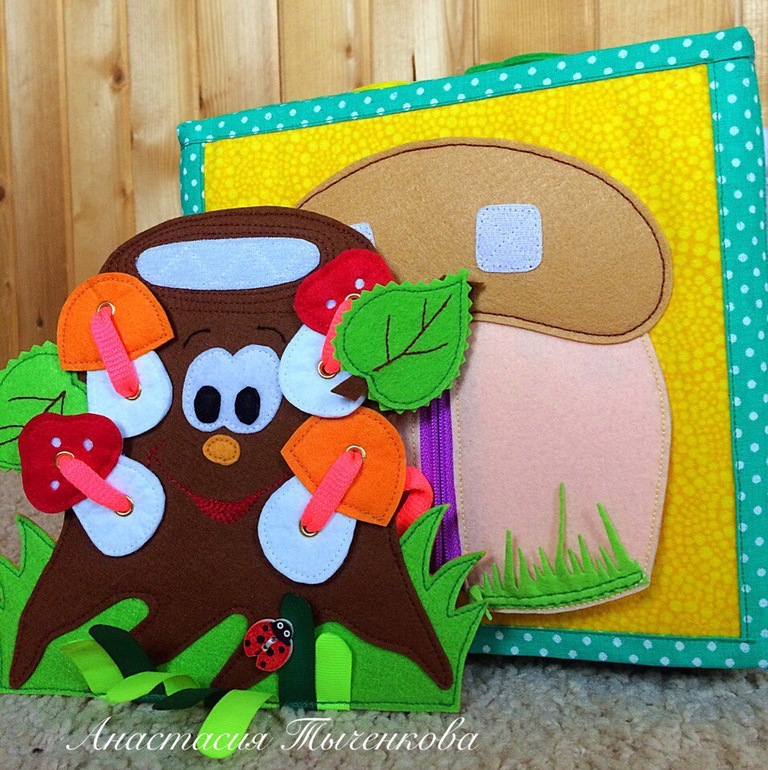 Шестая грань - грибок и пенёк. Самая любимая моя грань! Она такая яркая и позитивная, что непременно должна полюбиться малышу. Пенёк - это шнуровка.