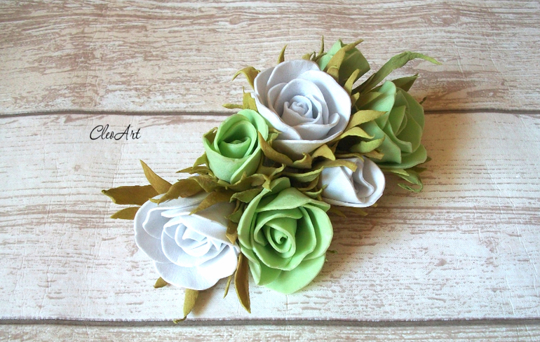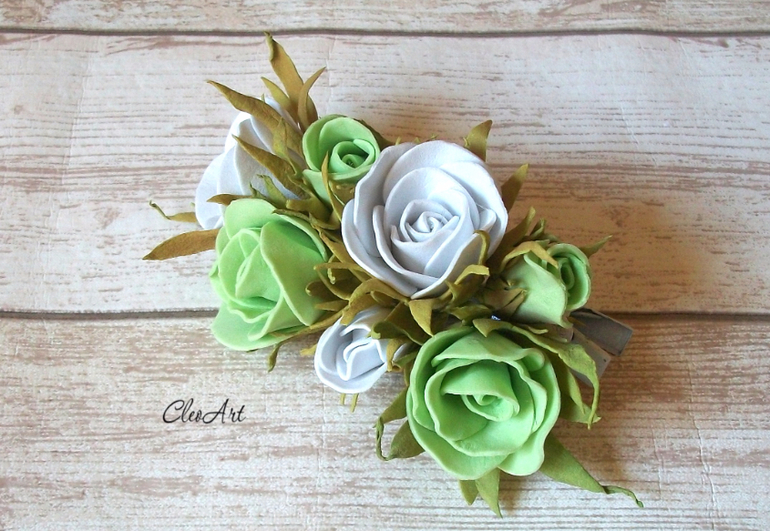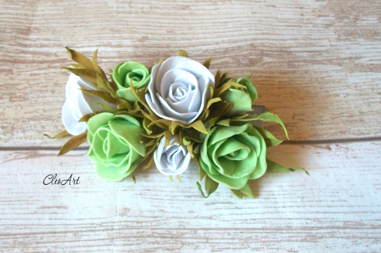 Украшение практически невесомо, не боится влаги, не выцветает со временем. Композиция из семи розочек надежно закреплена на зажим "крокодил" длиной 8 см.