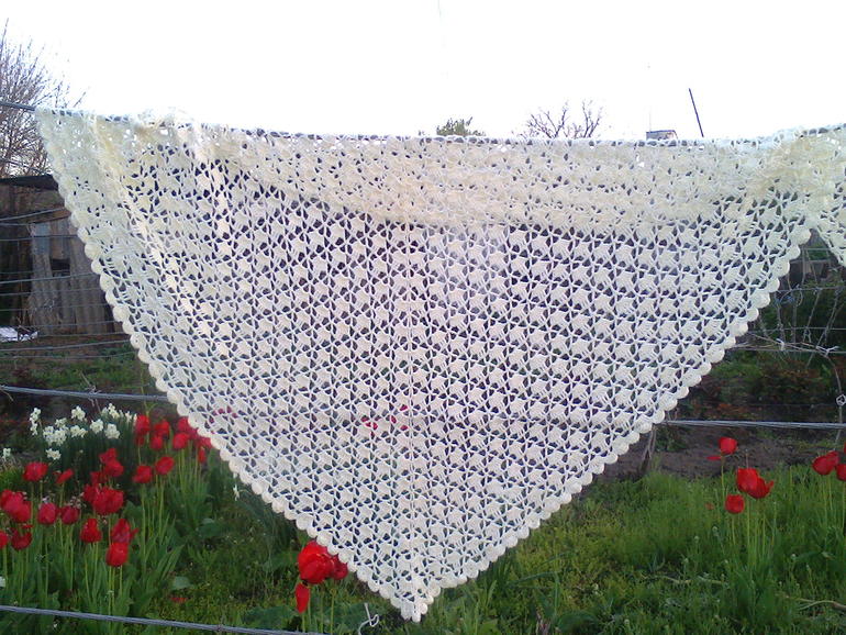 шаль выполнена для сестры на юбилей.получилась на 58 размер.