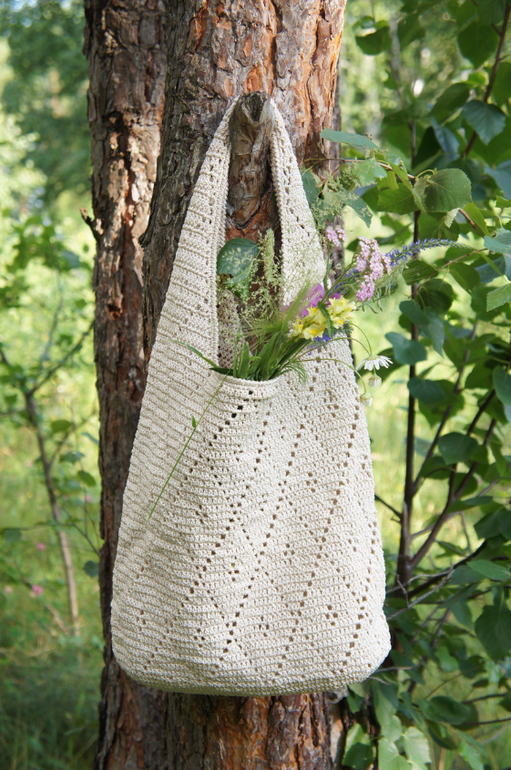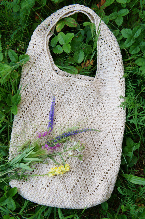 А тут выдался такой денёк!!! Яркое солнце, щебетание птиц, лесная клубника и земляника, цветы... Сумочка связана из ниточек "Носочная добавка". Крючок № 3. Расход чуть меньше 4-х мотков. Схемку увеличила в два раза в высоту.