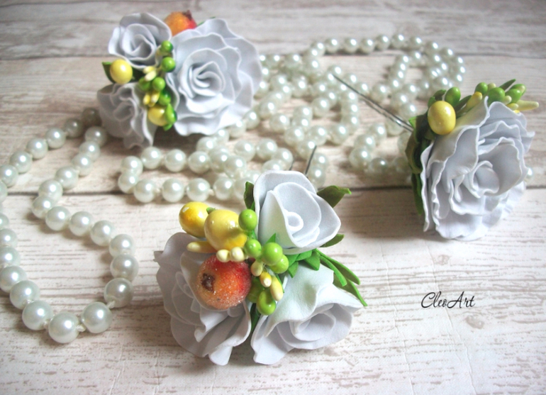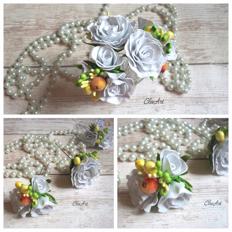 Цветы из ткани и форма. Канзаши. Украшения для волос.Комплект из трех шпилек "Очарование". Нежные белые розочки легко украсят прическу и помогут создать незабываемый образ. Композиция дополнена декором свежего зеленого цвета и сахарными ягодками.
