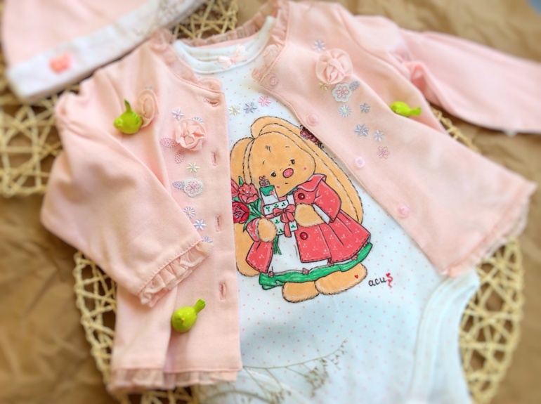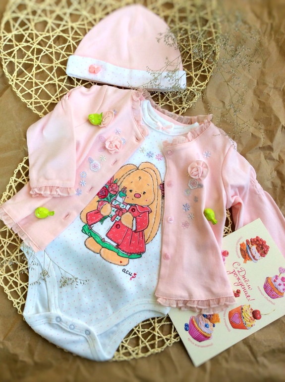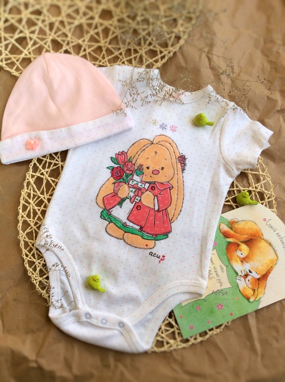 Увидела этот чудесный комплект в магазине, невероятно мягкий и нежный, решила приобрести для росписи. Маркировка 9 м, длина боди 39 см.