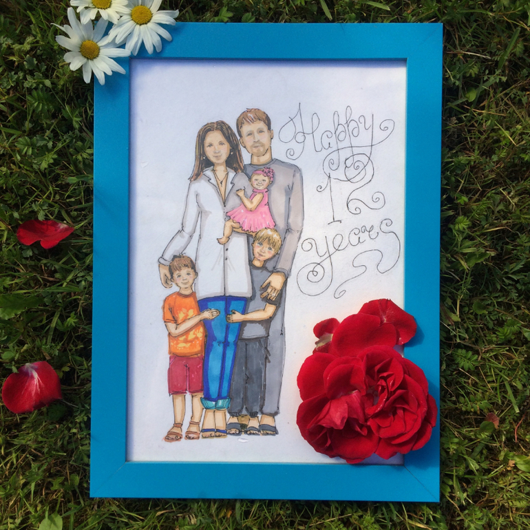 Ох, давно я в сообщество ничего не показывала. А тем временем увлеклась рисованием маркерами и по случаю нашей годовщины нарисовала мужу в подарок семейный портрет-мультяшку. Давно собиралась, а тут и повод подвернулся. Рисовала чисто на ощущениях, немного подглядывая в лица всех членов семьи. Короче говоря, можно считать, что это рисунок с натуры, а не по фото.