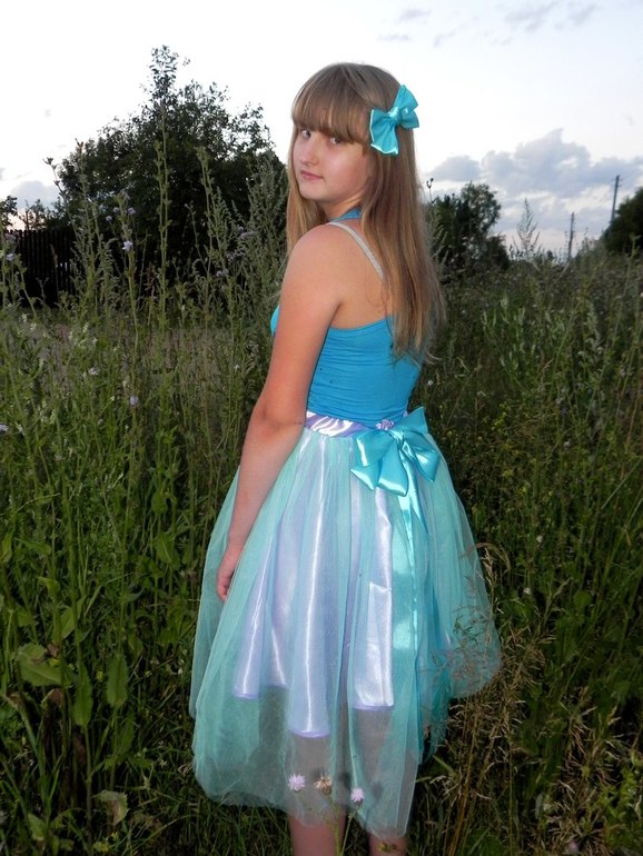 Шитье одежды, выкройки, ремонт одежды, шторы, швейные машины (уже приобретенные)Для создания нежного образа взяла я еврофатин мятного цвета, голубой атлас, в такой же тон - косую бейку и за вечер пошила нежную юбку для юной девушки. Бантики в тон подклада из атласной ленты.