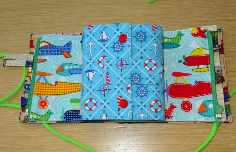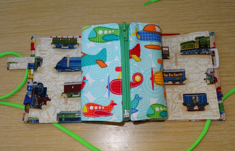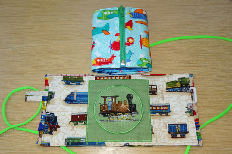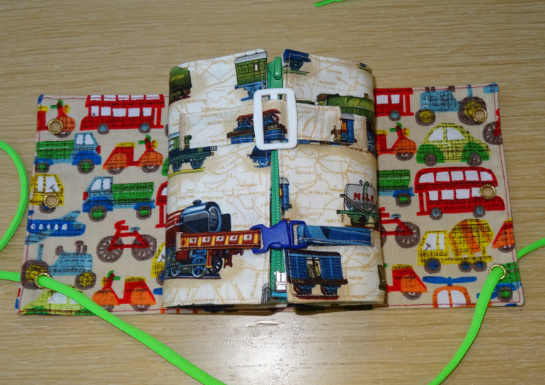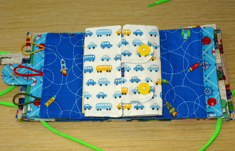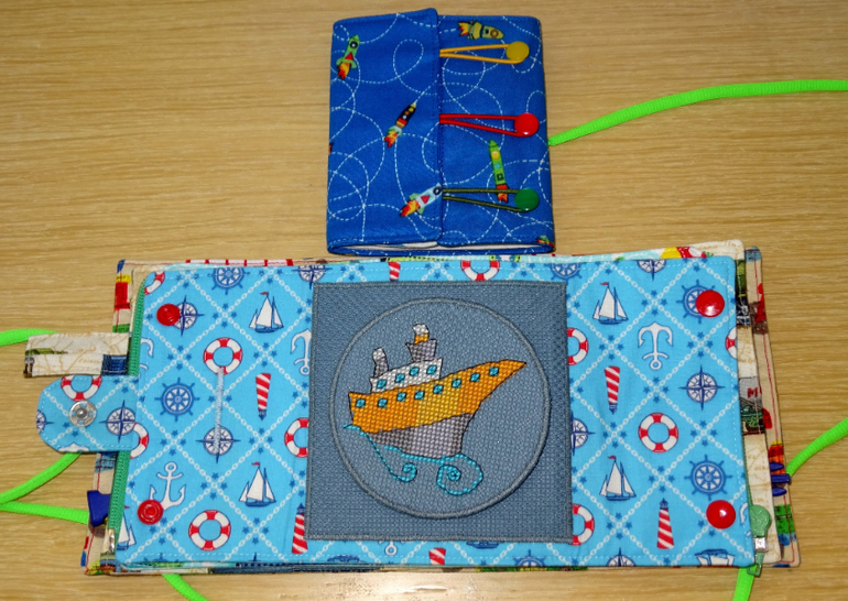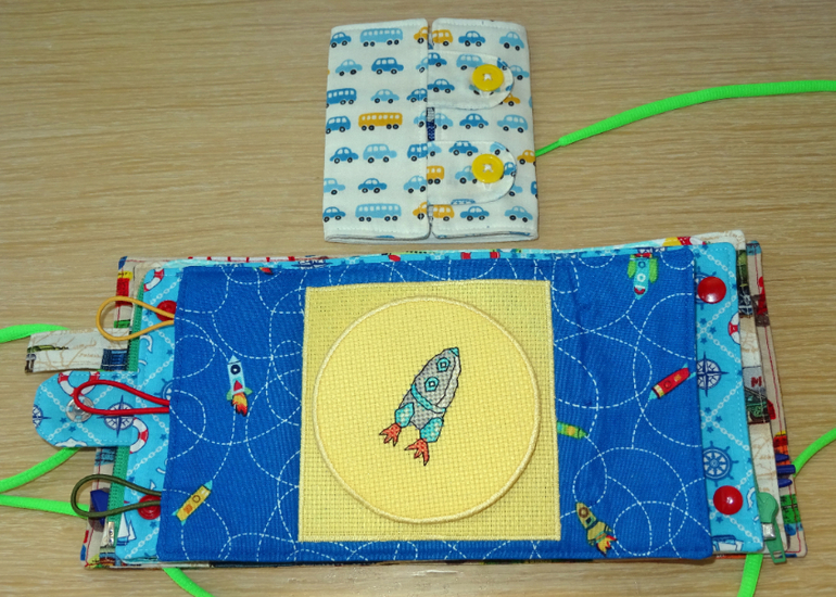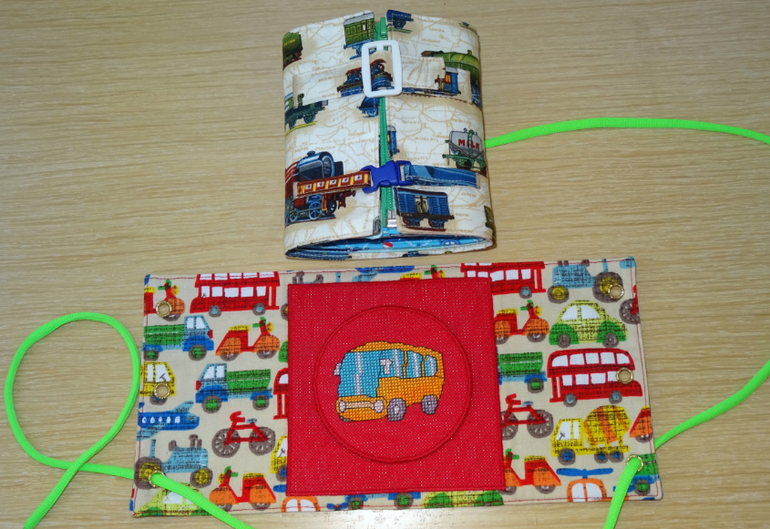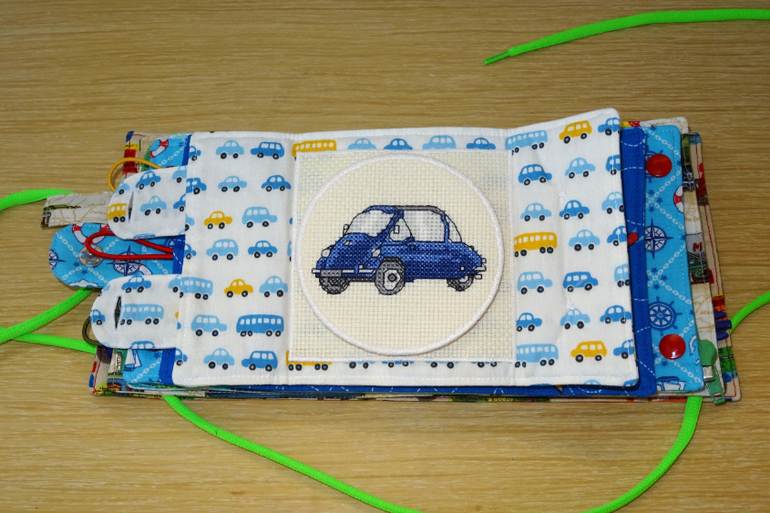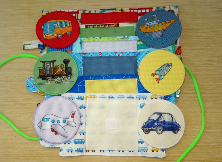 Эту игруху я шила для ребёнка 2х лет, которому ещё, конечно, будет очень сложно справиться с такими заданиями. Но я постаралась сделать её интересной и для него) Большое внимание уделяла тканям - они напоминают книжки для рассматривания. Можно даже просто рассматривать их с малышом, обсуждать что там изображено, искать одинаковые машины, считать их, смотреть какого они цвета и тд. Ну и внутренние элементы сделала довольно крупными по размеру, чтобы малышу было удобнее их отлепить - прилепить.