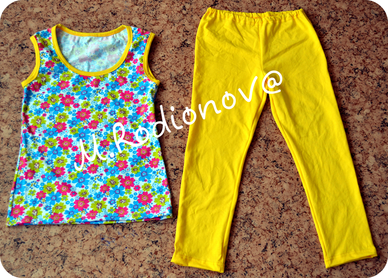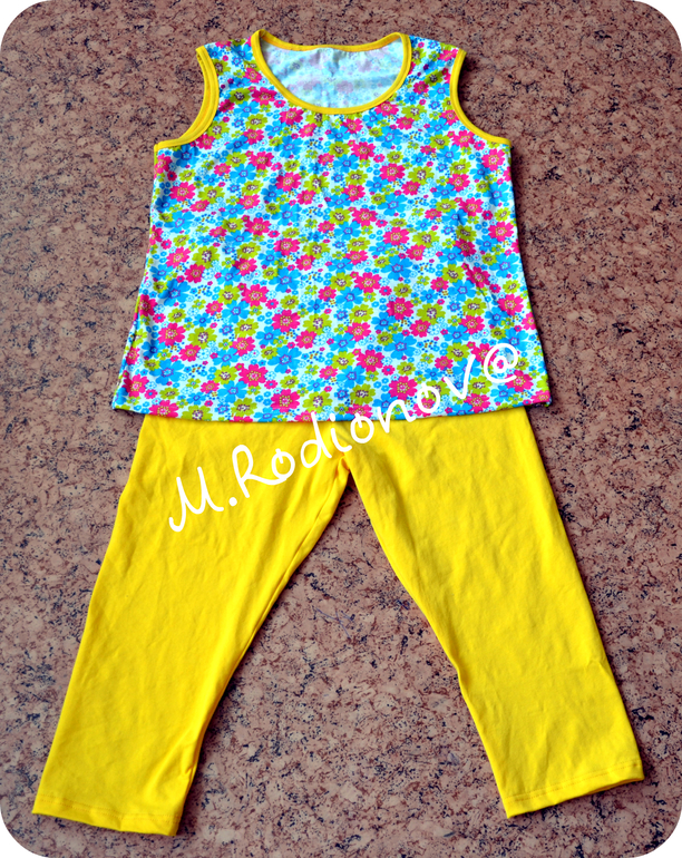 Костюм для мамы состоит из майки и укороченных лосин. Сшит из х/б кулирки (майка) и кулирки с лайкрой (лосины):
