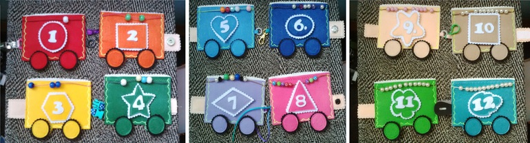 - научиться навыкам самообслуживания (каждый вагончик крепится к следующему при помощи различны застежек, которые не повторяются).