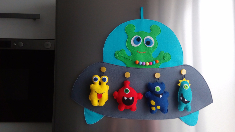 Вы думаете, что они прилетели, чтобы всё завоевать? Нет! Они прилетели, чтобы поиграть с малышом, подарить всем море позитива, а мамочкам дать немного времени, чтобы приготовить что-нибудь вкусненькое на кухне. Летающая тарелка благодаря неодимовым магнитам может приземлиться на любую металлическую поверхность, например, на холодильник, а также повиснуть на крючке благодаря петельке-антенне... А ещё очень интересно придумывать вместе с малышом имена для монстриков! Например, мой сынишка жёлтого монстрика сразу назвал Бекой, потому что он всем показывает язык и говорит «Бее..».