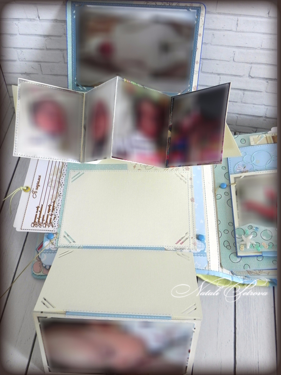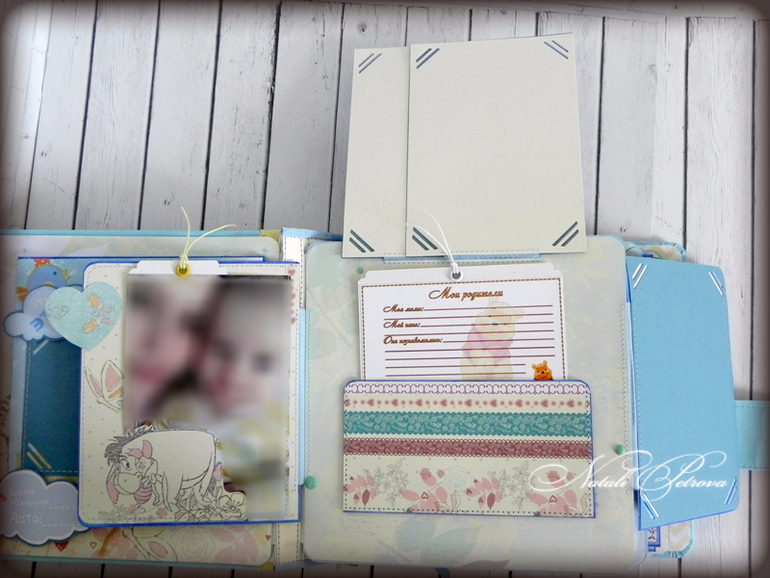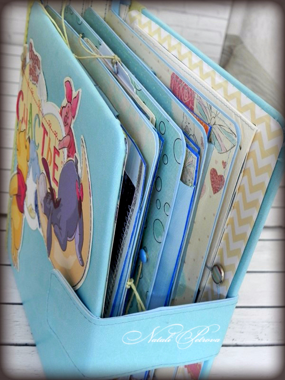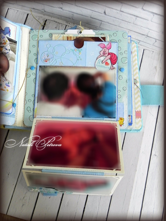 Итак, размер альбома 20х20, содержит пять разворотов на 70 фотографий (большей частью 10х15) В альбоме много секретиков, есть поп-ап элементы. На каждом развороте тежики для основных сведениях первого года жизни. Переплет очень прочный по МК Светы Ковтун. Для обложки впервые использовала переплетный кожзам и просто в него влюбилась. Он такой приятный на ощупь!!! К ткани теперь точно возвращаться не хочется.