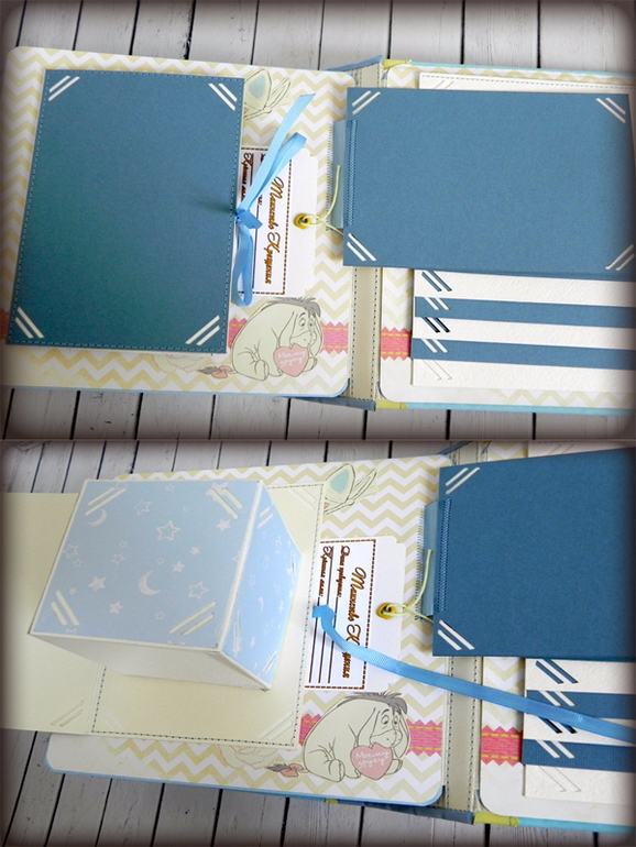 Страница первая. Горизонтальное фото закрывается на магнит, под ним прячется "выпрыгивающий" кубик. Стоит только развязать ленточку.