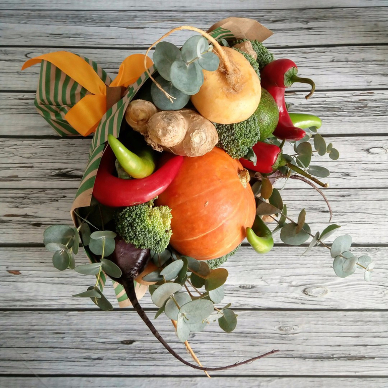 Очень красиво! Скажите, а на что вы крепите фрукты, овощи? На шпажки? В основании букета прячется флористическая губка? Как долго может простоять такой букет? если купить , например, 30 августа к 1 сентября он не будет выглядеть несвежим? Мне просто интересно, так как сейчас стали чаще здесь появляться такие творения, а в жизни реальной я их не видела. Повторюсь, что Вашими работами я восхищена!!!!