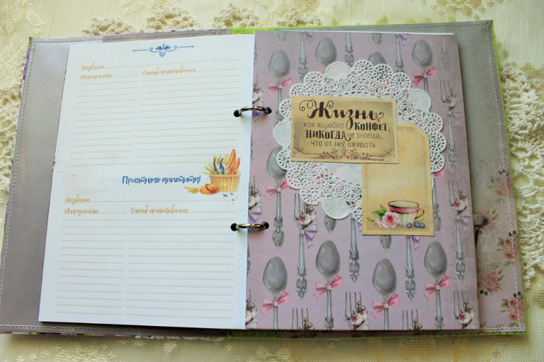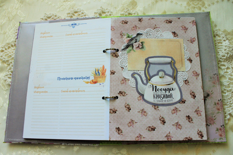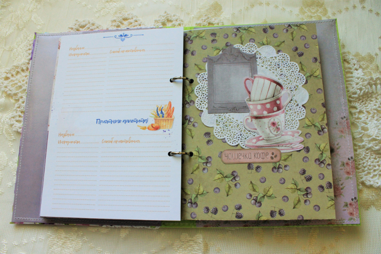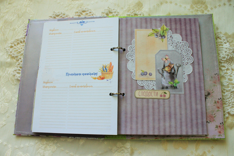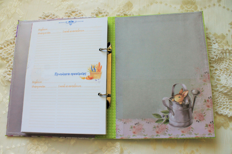 СкрапбукингЭта бумага от СкрапМира ну очень хороша! Сделала из нее кулинарочку с кольцевым мханизмом. Внутри 120 страниц для записей репептов, 6 не подписанных разделителей с кармашками, также кармашки ест и на форзацах
