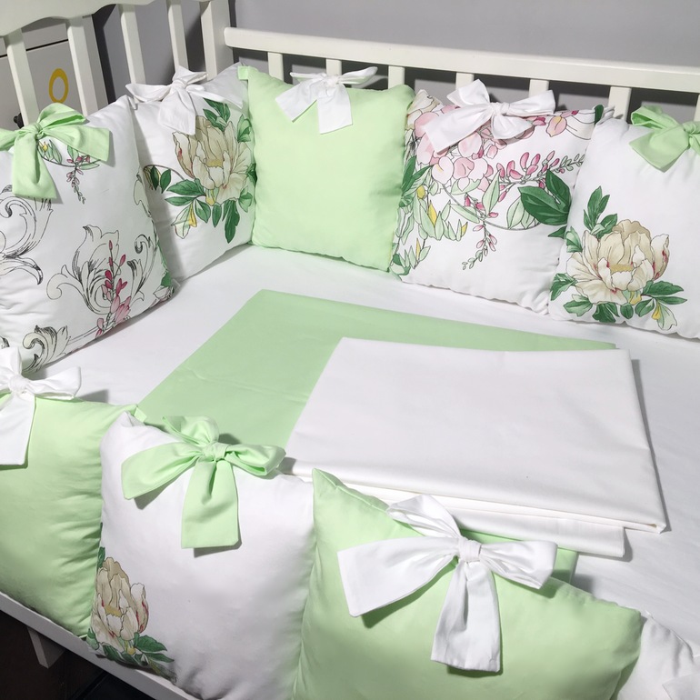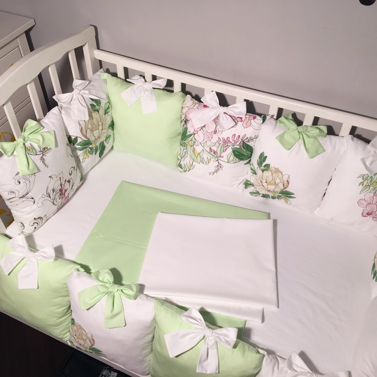 Шитье одежды, выкройки, ремонт одежды, шторы, швейные машины (уже приобретенные)Новый комплектик. Такой нежный и свежий. Сшито из сатина, отделка банты-завязки. Каждая подушечка с индивидуальным рисунком - будет что рассмотреть малышу).