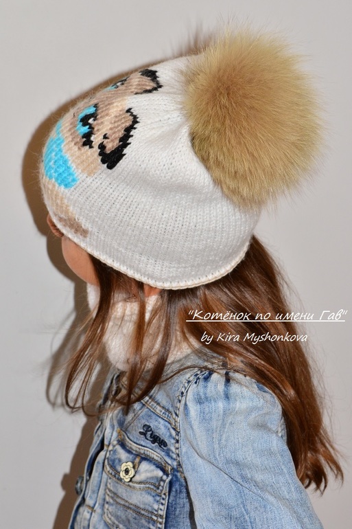 Рисунок из разной пряжи, подходящей по цвету. Помпон - натуральный мех.
