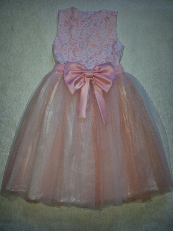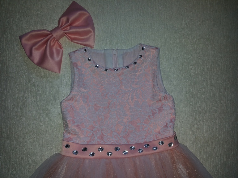 Фатина три слоя, нижний слой фатин персикового цвета средней жесткости, и два слоя белого,мягкого фатина. Честно, хотела совсем другое, но не нашла кое чего в наших магазинах. Бант съемный, сзади платье на молнии. К платью сделала заколочки из фоамирана.Еще из остатка от юбки племянницы сшилась фиолетовая фатиновая юбка.