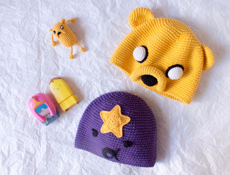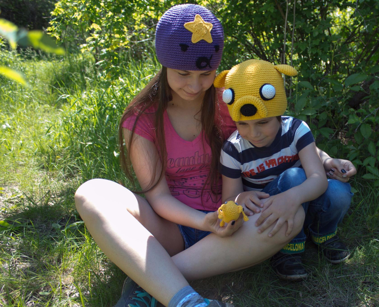 А тут еще один набор) Шапки их любимого (более чем странного) мультика у моих детей "Время приключений". Ну, и в шапках тоже они - мои дети) До кучи еще была связана игрушка пса Джейка.