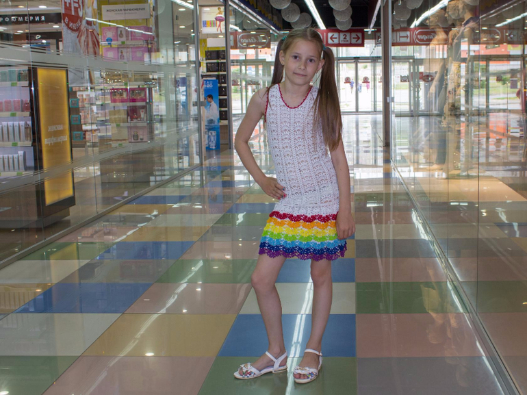 Начну, пожалуй, с сарафанчика, связанного для девочки 9 лет - худенькой и высокой для своего возраста. Вот такое получилось чудо!