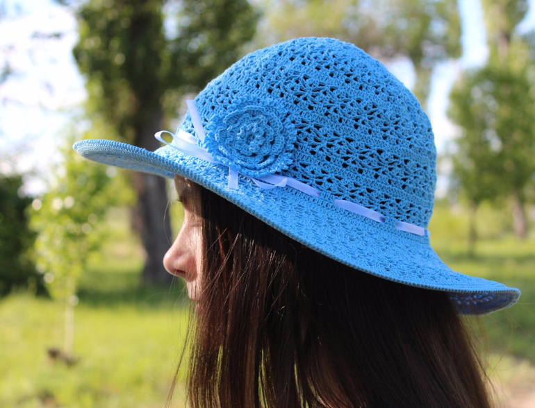И еще взгляд в ушедшее лето - шляпа) Не в первый раз я уже такую вязала, но всегда - красотища получается. Обожаю шляпы)