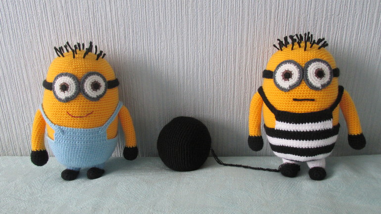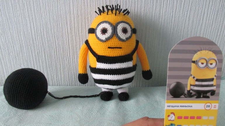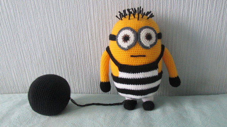 Амигуруми (вязаные игрушки)Связала очередного миньона. Но не простого, а тюремного - в полосатой форме и с гирей, привязанной к ноге. Такого миньона захотел один большой мальчик, который в принципе на миньонах не помешан, но раз уж они теперь везде, то пусть уж будет и у него один.