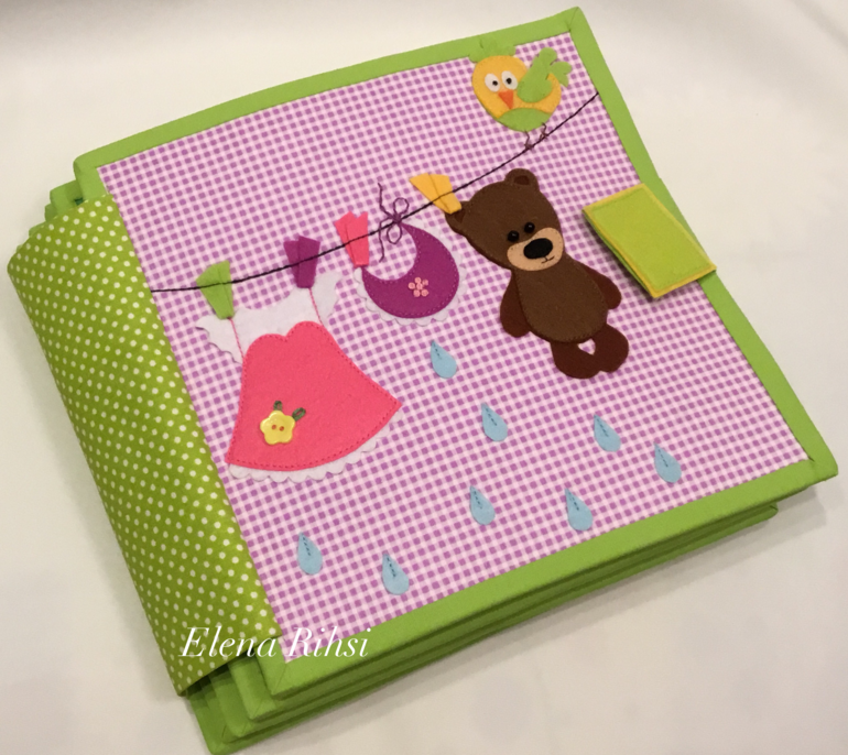 Размер страничек 21*21см, четыре разворота. Сшита из фетра и ткани(хлопок), застёгивается на магнитную кнопку. На задней обложке вместительный карман.