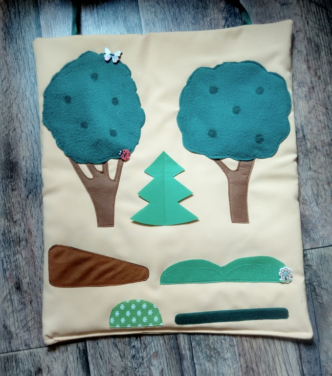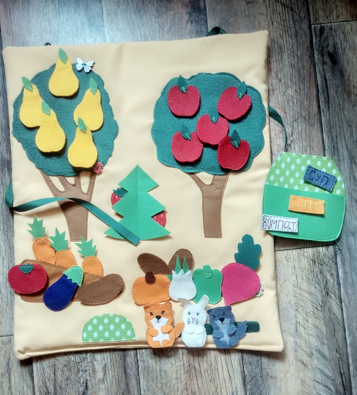 Развивающие игрушкиХочу показать свою новинку. Это из серии, чем занять малыша в дороге. Шила в подарок крестнику и его сестрёнке, причем идею подкинула их мама. Игровое поле размером 42*50 см, с элементами велкроткани. И в комплекте съёмные элементы - больше 20-ти овощей и фруктов, три пальчиковые игрушки и ёмкость для джема, супа или компота. Всё на липучках. Сзади карман. Крепится к спинке кресла лентами. Вариантов игры много. Спрашивайте, расскажи в комментариях