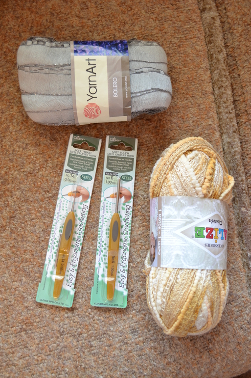 Пряжа для шарфов (1 моток=1 шарф) и крючки для вязания фирмы "Кловер", размером 0,5 и 1 (очень маленькие), для любителей воздушной вязи из ниток))))