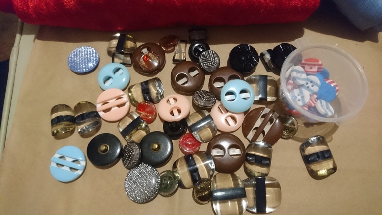 2 кусочка ткани, пепельно-синий (по моему х/б) и вишнево-красный. много разных пуговиц.