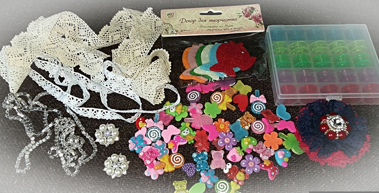 Слон №10 от Анастасии https://www.babyblog.ru/user/lenta/id1825359Вырубка из фетра, набор шпулек для швейной машинки, 2 вида х.б. кружева по 1 м., 2 серединки для цветочков на метал. основе, стразовая лента 1 м. (размер S16 или S18, точно не помню. Это большой размер...стразы примерно 4 мм.), 52 кабошона (специально выбирала парные по форме и цвету) и заготовка цветочка для резиночки, заколочки, ободочка или брошки