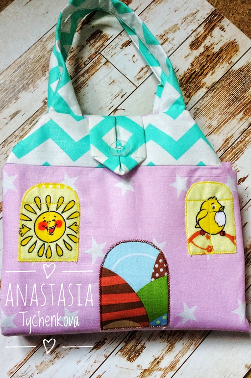 Развивающие игрушкиКогда я была маленькой, в моем советском детстве, были только пластмассовые пупсы. А хотелось всегда чего-то душевного, маленького и миленького. Именно поэтому я, когда родилась дочка, начала скупать все домики, которые видела. А когда начала шить, то первыми стали домики. Эту сумочку-домик я сшила в детский сад дочки по МК Ольги Вайды.