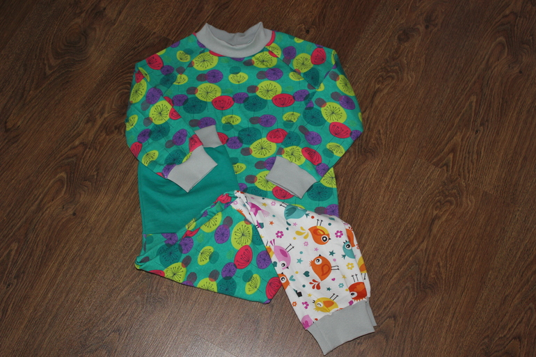 Выкройка пижамных штанов взята с основы обычных спортивных трико, верхняя часть комплекта - из одного из старых журналов Оттобре. Вот люблю шить пижамы с рукавом реглан, потому что при этом можно взять размер немного с запасом, а за счет кроя это не будет смотреться слишком велико на ребенке.