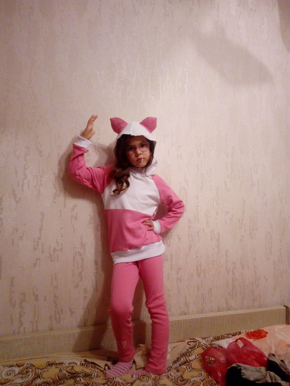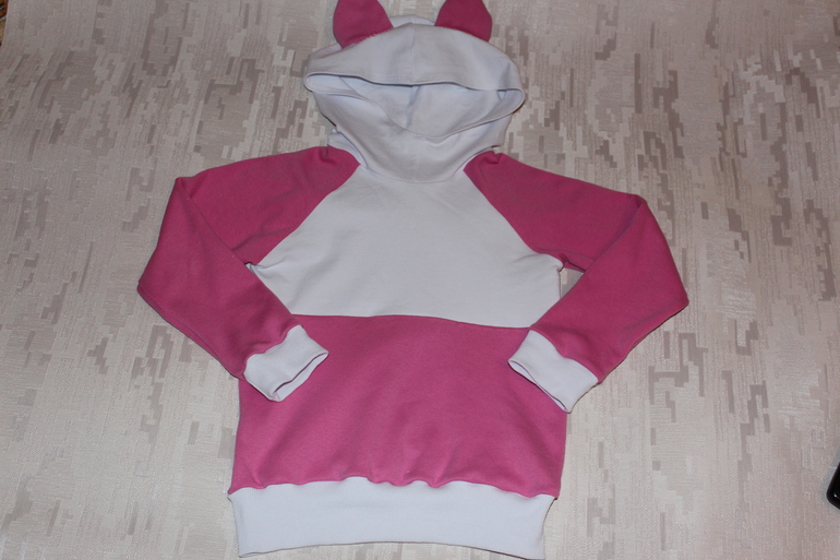 В садике стало холодно спать, надо было сшить пижамку. Из остатков от лосин и тонкого белого футера сшилась кофточка к пижамке (дочь попросила непременно с ушами) Шила по той же выкройке, что и толстовка с бабочками, только без припусков. Капюшон из другой выкройки того же журнала. манжеты из кашкорсе. Уши рисовала на глаз, слегка наполнила утеплителем.