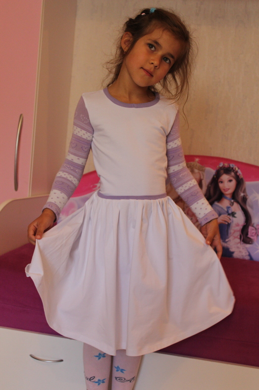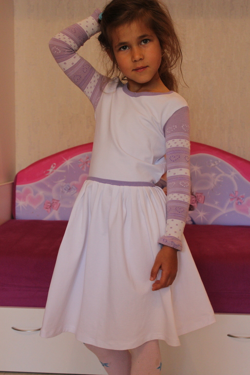 Платье по своей выкройке. Цветовая гамма выбиралась под рукава. Угадайте из чего они?))) В наличии был тонкий белый футер - грудка и спинка, белая кулирка - юбка, готовая сиреневая бейка из рибаны. Горловину пришила не правильно (перепутала спинку и полочку), переделывать не стала, думаю чем бы скрыть/украсить...