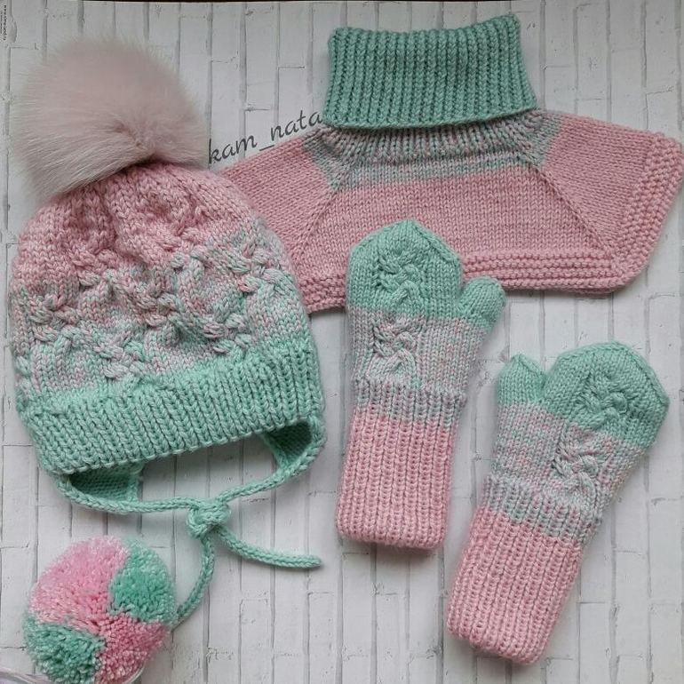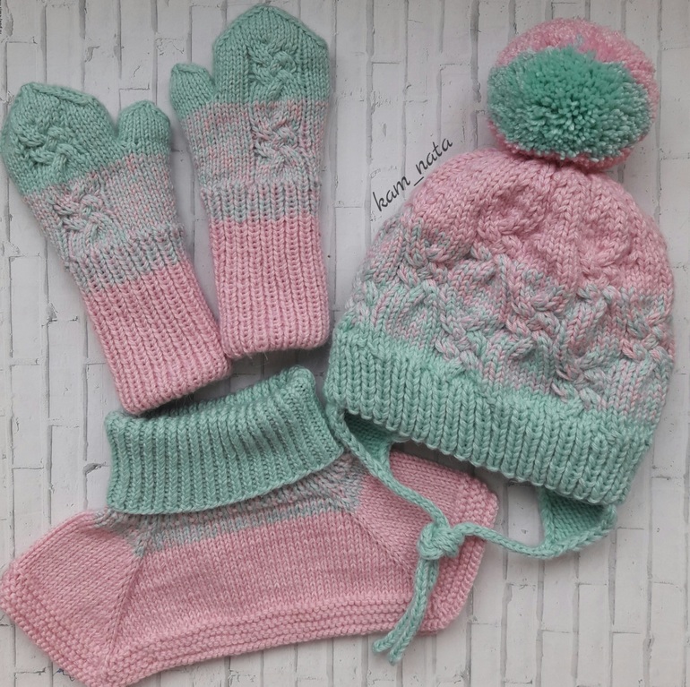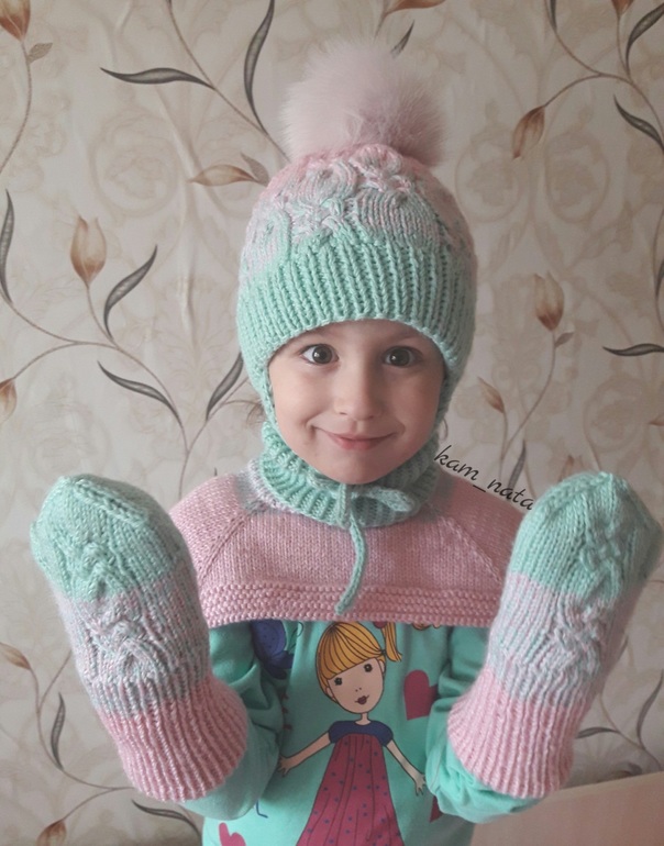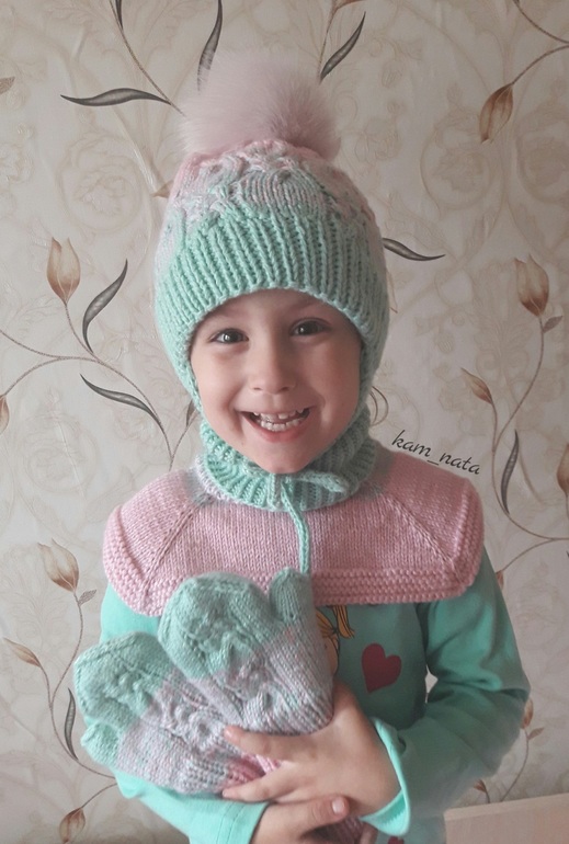 Готов очередной комплект для девчульки-красотульки.. вышел очень нежный как по виду так и по тактильным ощущениям. Двойная шапочка, двойные варежки и манишка из детской полушерстяной пряжи. К комплекту также был изготовлен двухцветный помпон.. Связан на заказ!