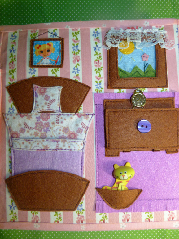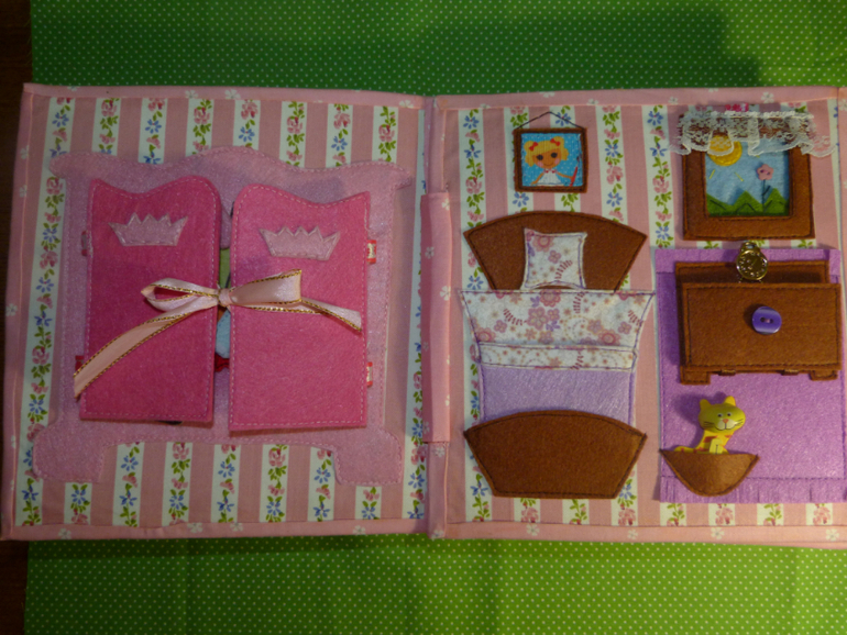 1. Разворот - спальня. Карточка в окне меняется на день - ночь, в комоде лежат необходимые для всех девочек предметы, в шкафу - одежда.