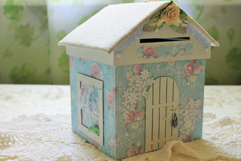 СкрапбукингРаз озадачили меня вопросом - делаю ли я копилки? и вот что получилось - Домик со съемной крышей, общая высота 19см, сама коробочка 14,5*13см, высота 14см. В отверстие можно кидать не только монеты, но и купюры. Основа домика переплетный картон, обклеен скрапбумагой Шебби дримс, а крыша обтянута льном