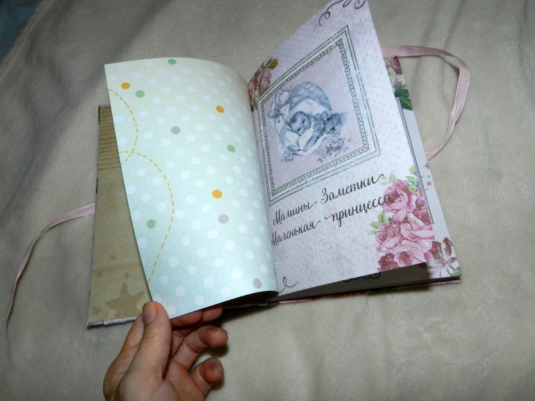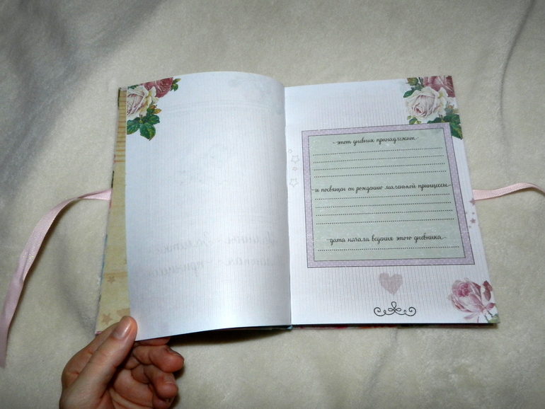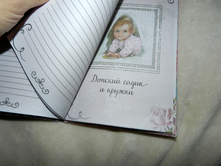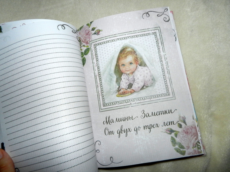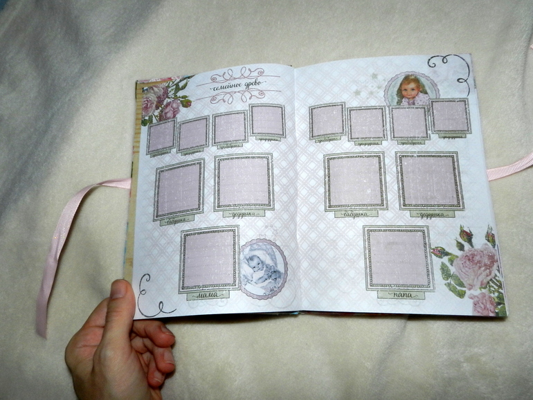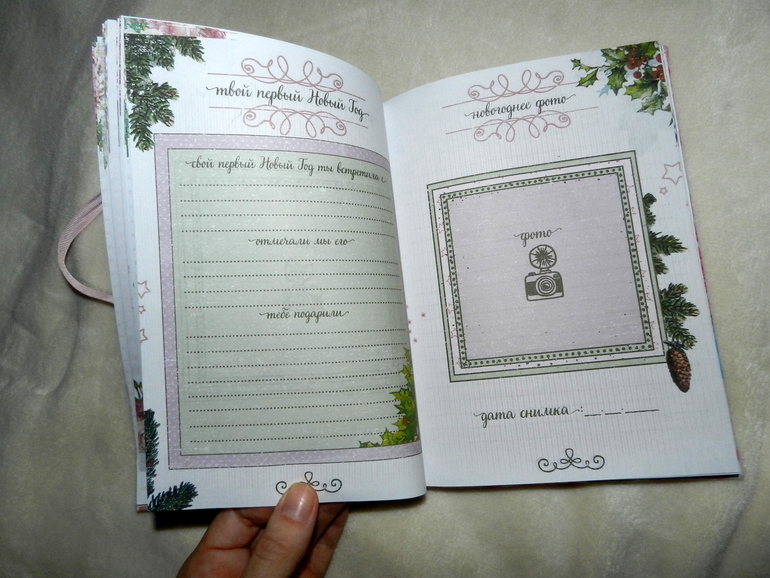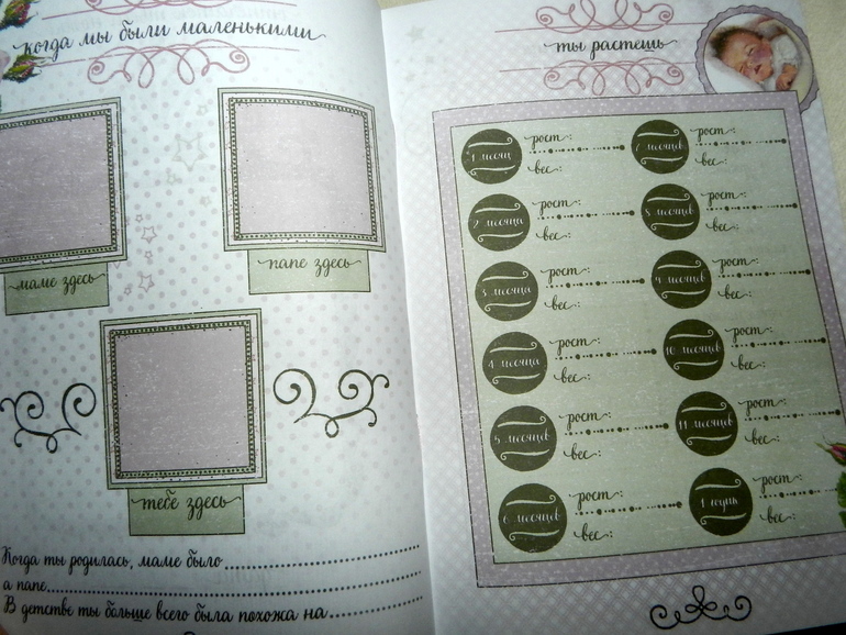 Как обычно. ооочень много тематических страничек, различные графики роста, анкета, места для отпечатков ножек, ручек, для первых рисунков, места для фото-около 30 штук, конвертики для писем и рисунков. семейное древо! В общем все. чтобы сохранить целую Историю Маленькой Принцессы! Сохранить надолго, красиво, бережно!!!!