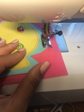 Наша страничка почти готова. Осталось вырезать три круга такого же цвета как и пуговки. Прорезаем в них петельки и прошиваем по краю. Ну и конечно надо сделать глазик))