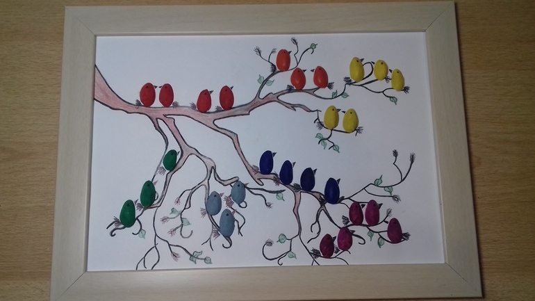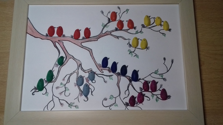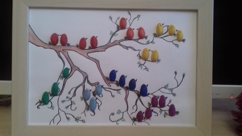 Смело могу сказать , что большую часть работы делала доча: красила птичек/фисташки (использовали и акварель и гуашь, что лучше ложилось. Лучше, думаю, было бы лаком для ногтей, но покупать все цвета радуги, мне не захотелось). То, что здесь цвета радуги, уверена, Вы догадались! Так же дерево доча сама разукрашивала. Ну, я подкорректировала чуточку и приклеила птичек. Клюв и хвост просто рисовала черной ручкой.