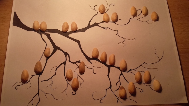 Дочь учится во 2 классе. И в школе дали задание изобразить птиц. Дочь сумбурно рассказала, что нужен или рисунок птиц, или аппликация из природных материалов - тема та же. В классе тоже все владели разной информацией (кл.руководитель на тот момент болела). Оказалось, что с рисунком мы опоздали, да и нужна была поделка из природных материалов на любую тему. Вообщем, мы пофантазировали и получилась аппликация "Попугайчики на ветке". Сами попугайчики - это половинка скорлупы фисташек.