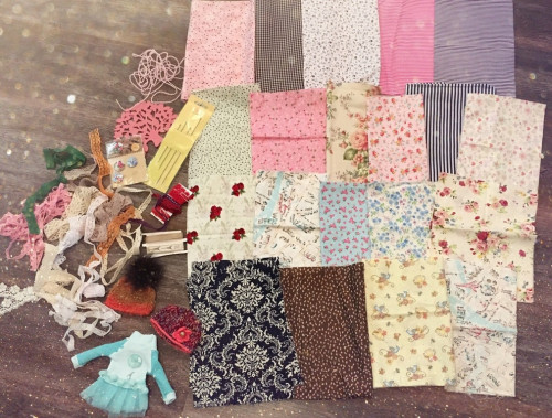 20 отрезов ткани, отрезы разнообразного кружева, бусы, набор игл, пуговиц, ленты, 2 шапки и платье для кукол и игрушек, плюс рукодельный сюрприз и вкусняшка.