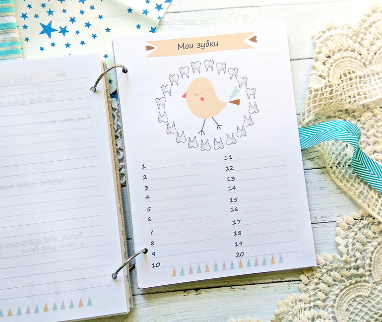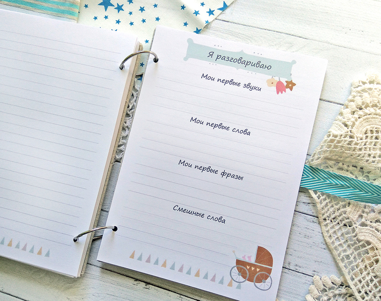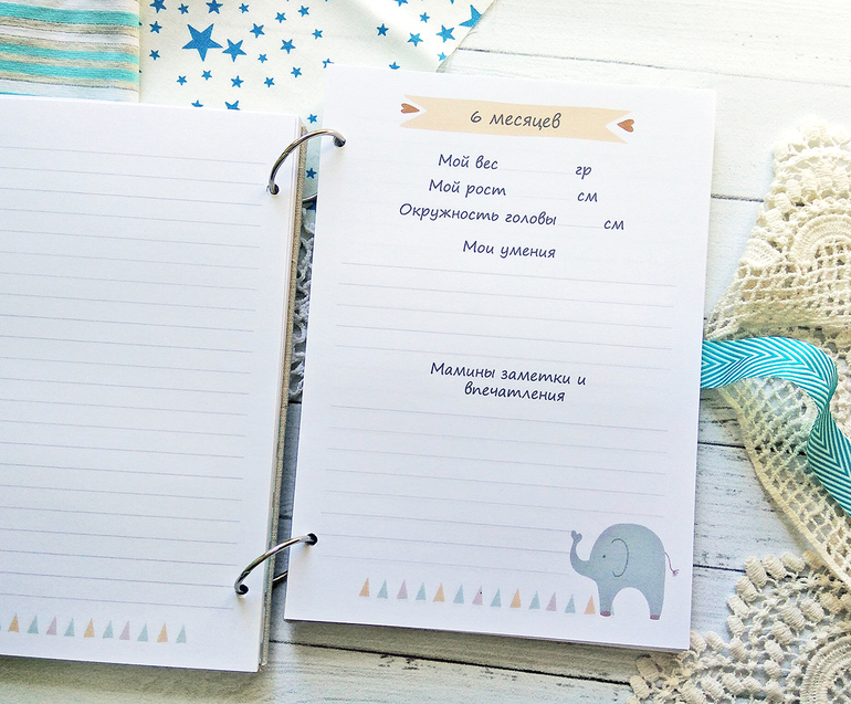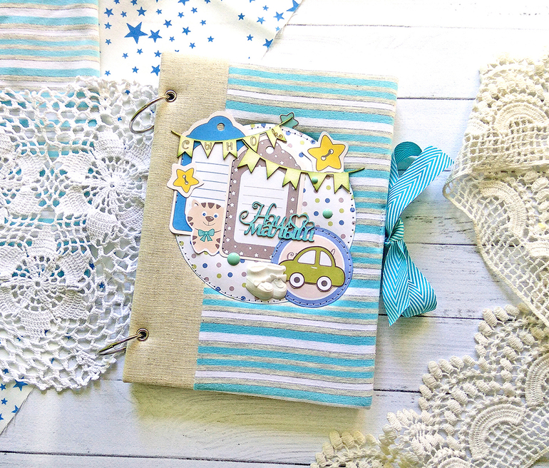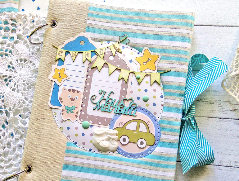 СкрапбукингВсем привет! Очень нежный бебибук/мамина книга для мальчика - замечательный подарок для любой мамы! Такой дневник поможет сохранить в памяти самые важные, самые нужные, самые трогательные моменты детства Вашего сыночка - с рождения до года!) Размер А5, 100 листов, внутри есть несколько мест для фото, также разные тематические страницы: "В ожидании меня", "УЗИ", "Привет! А вот и я", "Мои зубки", "Отпечатки ручки и ножки", "Мои первые шаги", "Я разговариваю" и на каждый месяц.